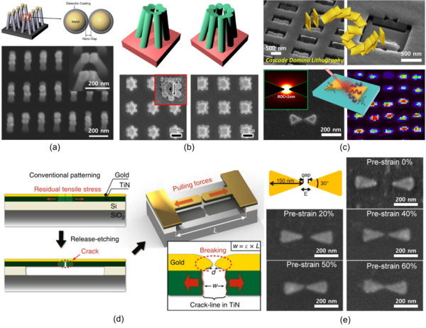 Sub-10 nm nanostructures have received broad interest for their intriguing nano-optical phenomena, such as extreme field localization and enhancement, quantum tunneling effect, and strong coupling. The range of cutting-edge applications based on single-digit-nanometer scale structures has expanded with the development of nanofabrication technologies. However, challenges still remain in overcoming fabrication limits, such as scalability, controllability, and reproducibility for further practical applications of the sub-10 nm nanostructures. In this review, we discuss the recent advances in top-down nanofabrication methods towards single-digit-nanometer-sized structures. The well-known examples include electron beam lithography (EBL), focused ion beam (FIB) milling or lithography, atomic layer deposition (ALD), and other unconventional techniques to obtain sub-10 nm nanostructures or nanogaps. We discuss state-of-the-art applications for sub-10 nm nanophotonics such as optical trapping or sensing devices, imaging devices, and electronic devices.