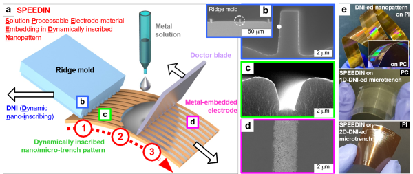 Solution-processable electrode-material embedding in dynamically inscribed nanopatterns (SPEEDIN) for continuous fabrication of durable flexible devices