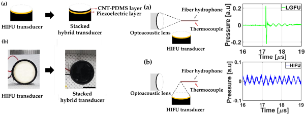 Experimental Demonstration of a Stacked Hybrid Optoacoustic-Piezoelectric Transducer for Localized Heating and Enhanced Cavitation