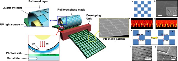 Continuous phase-shift lithography with a roll-type mask and application to transparent conductor fabrication