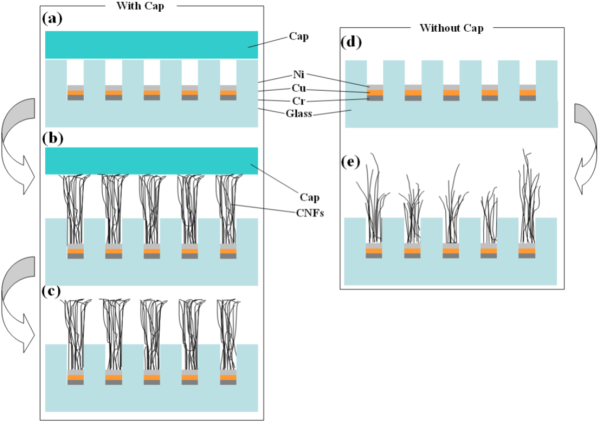 Uniformity is one of the most important qualifications for reliable field emission devices based on carbon nanofibers (CNFs). We synthesized CNFs by thermal chemical vapor deposition at 600 °C on the glass substrate, promising practical large-area applications. A glass cap was introduced to enhance the uniformity of CNF emitters vertically grown under the guidance of micro-grooves, which provided passages for the diffusion of precursor gas to CNF growth sites. Our CNFs, vertically leveled by the glass cap with the support of the micro-grooves, and without any post-treatments, showed excellent uniformity in field emission as well as long-term stability.