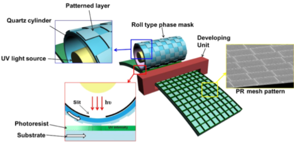Continuous phase-shift lithography with a roll-type mask and application to transparent conductor fabrication