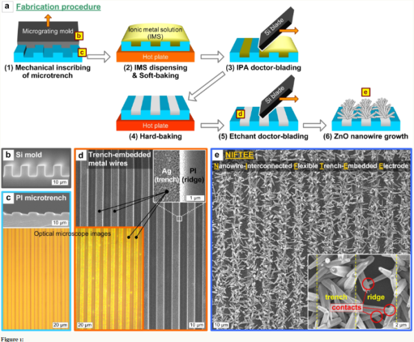 We demonstrate the facile fabrication of metal-wire-embedded microtrenches interconnected with semiconducting ZnO nanowires (ZNWs) through the continuous mechanical machining of micrograting trenches, the mechanical embedding of solution-processable metal wires therein, and the metal-mediated hydrothermal growth of ZNWs selectively thereto. The entire process can be performed at room or a very low temperature without resorting to vacuum, lithography, and etching steps, thereby enabling the use of flexible polymer substrates of scalable sizes. We optimize the fabrication procedure and resulting structural characteristics of this nanowire-interconnected flexible trench-embedded electrode (NIFTEE) architecture. Specifically, we carefully sequence the coating, baking, and doctor-blading of an ionic metal solution for the embedding of clean metal wires, and control the temperature and time of the hydrothermal ZNW growth process for faithful interconnections of such trench-embedded metal wires via high-density ZNWs. The NIFTEE structure can function as a bending-sensitive optoelectronic sensor, as the number of ZNWs interconnecting the neighboring metal wires changes upon mechanical bending. It may benefit further potential applications in diverse fields such as wearable technology, structural health monitoring, and soft robotics, where bending-sensitive devices are in high demand.